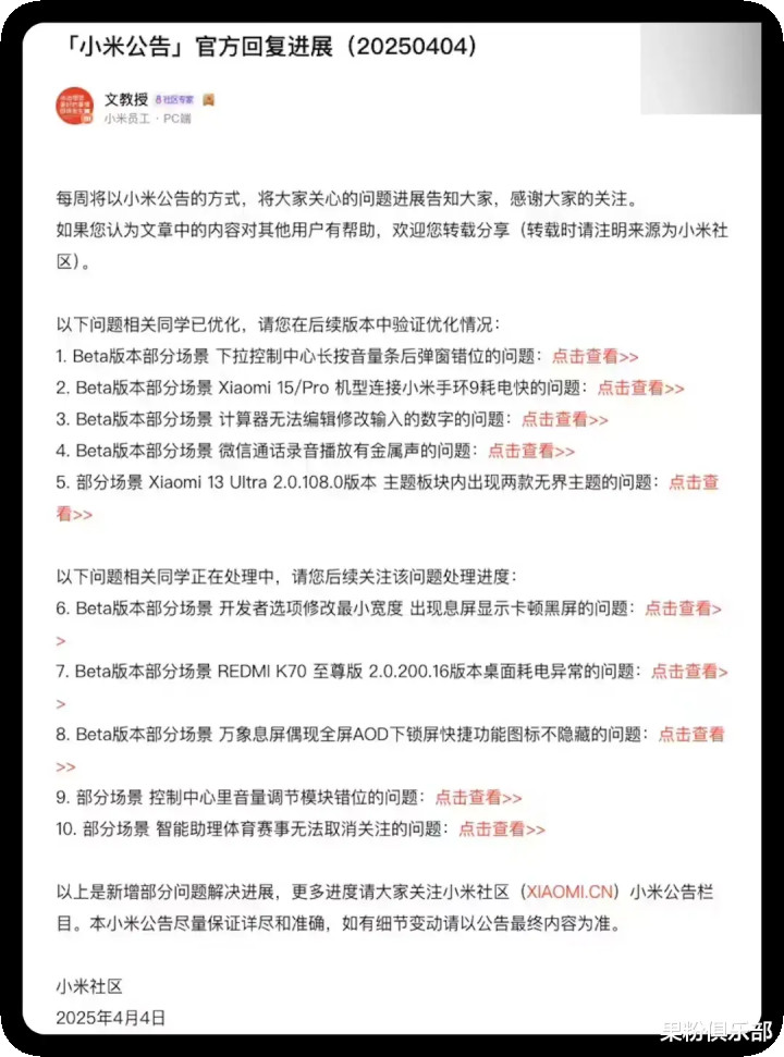 截至目前,包括控制中心音量条弹窗错位、小米 15/Pro 连接小米手环 9 异常耗电、微信通话录音金属杂音。