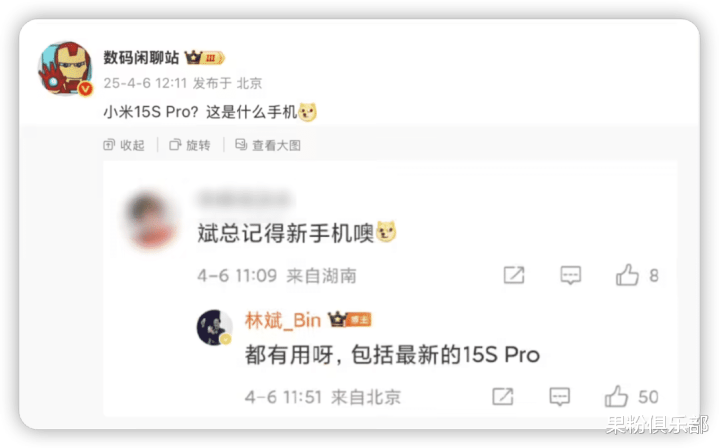 而另一边,小米联合创始人林斌在互动中「手滑」官宣了传闻已久的新机——小米 15S Pro。