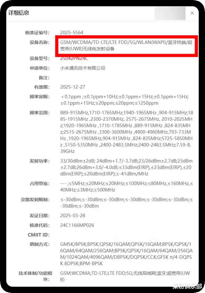 上月底小米一款型号为 25042PN24C 的新机通过了工信部无线电核准,支持超宽带(UWB)无线电发射。